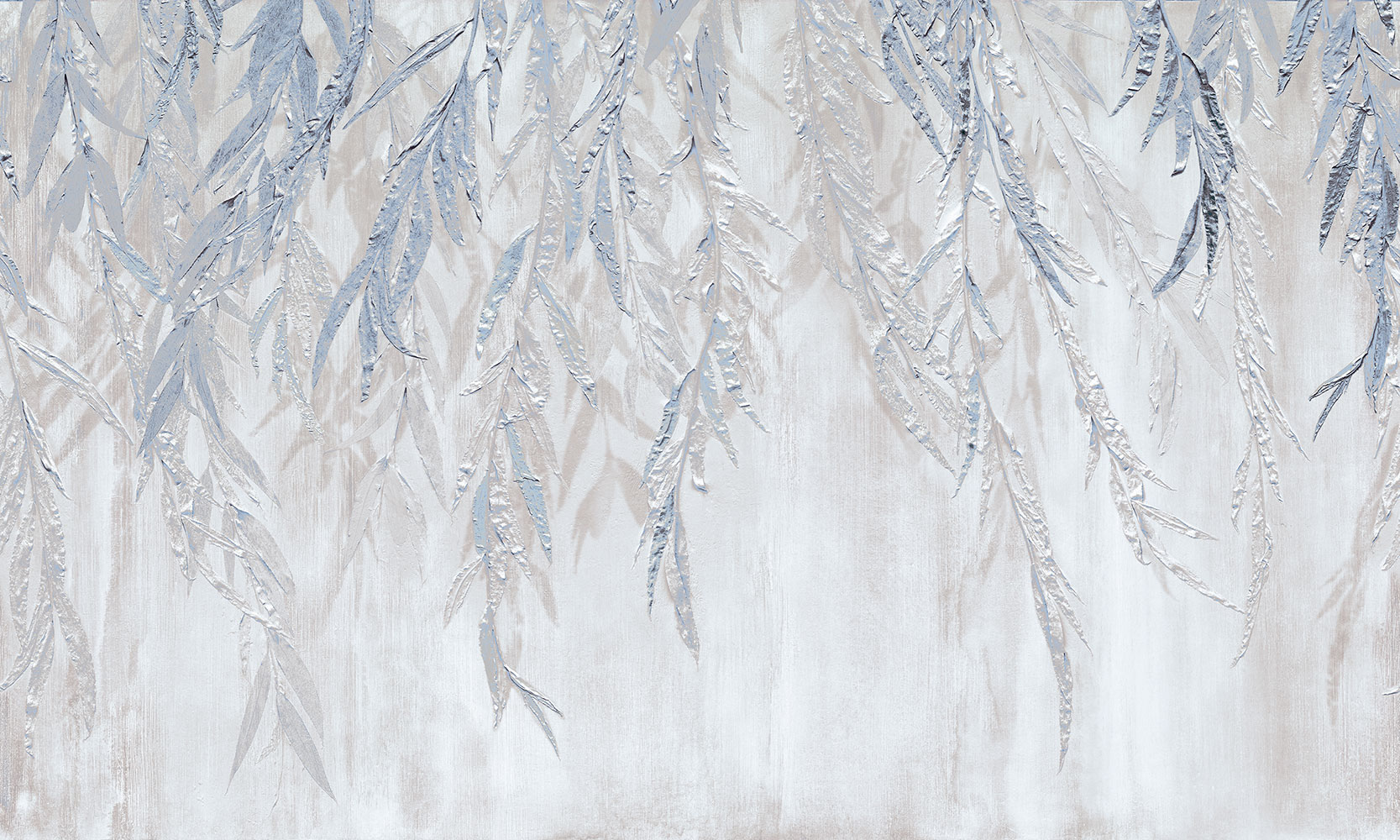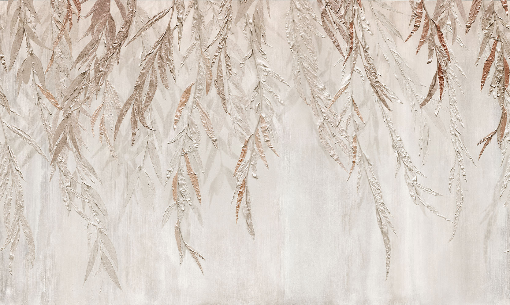 Chloé presenta fronde eteree che si sviluppano verticalmente, creando ritmo delicato e continuità. Tonalità soffuse e texture cementizia conferiscono profondità discreta, trasformando la parete in uno sfondo elegante e contemplativo, ideale per camere, lounge, spa, living e ambienti professionali raffinati.