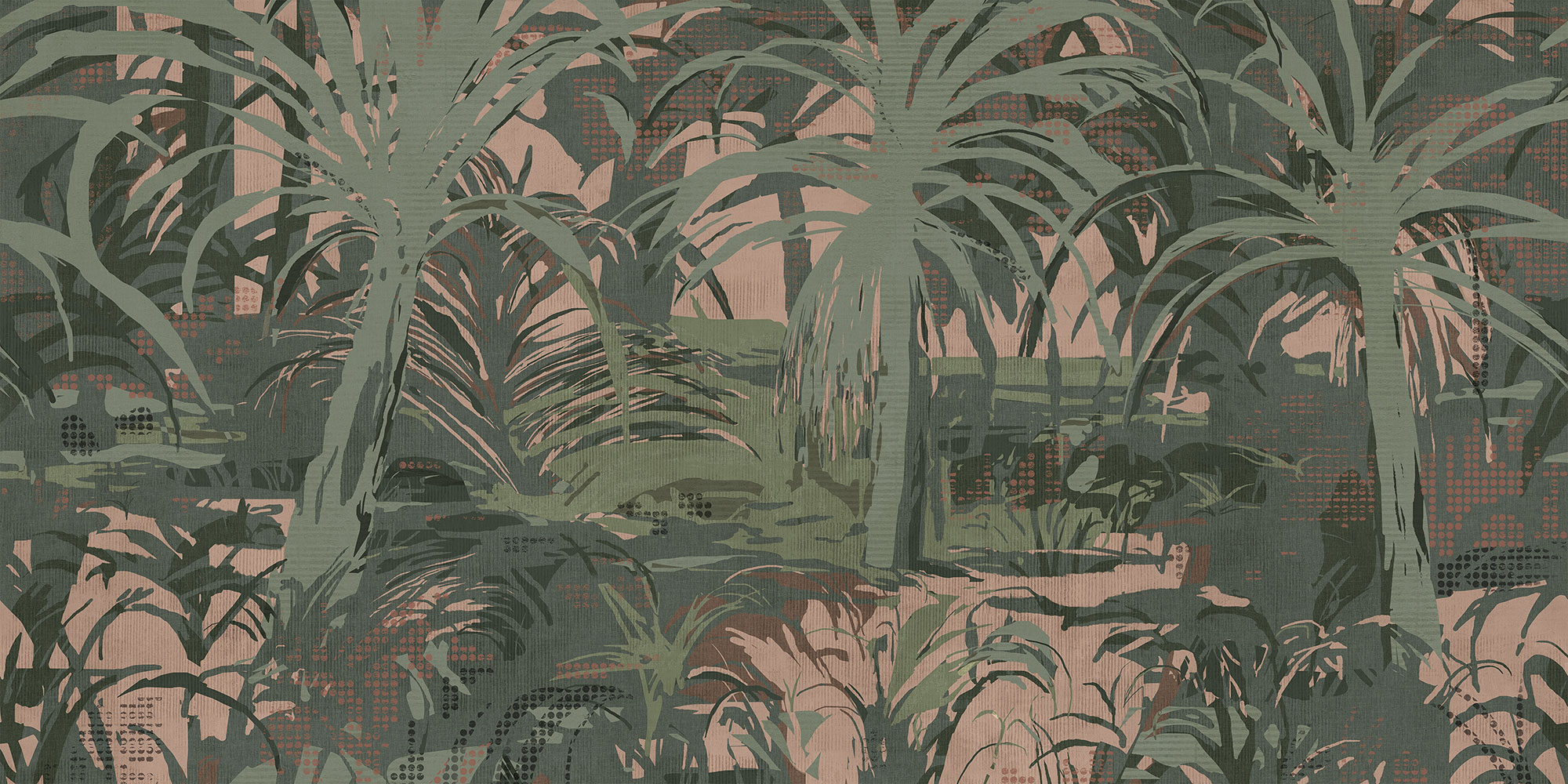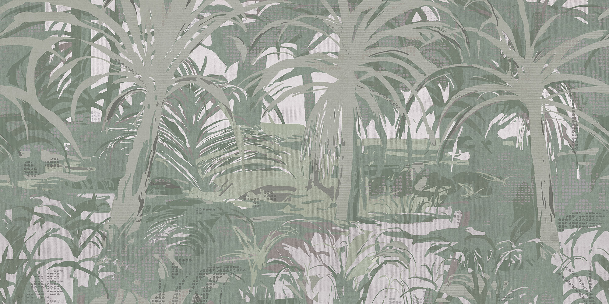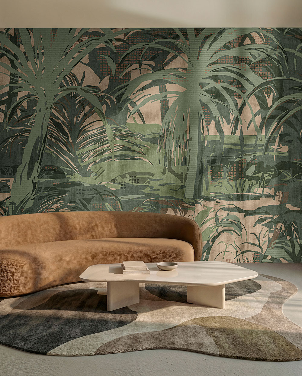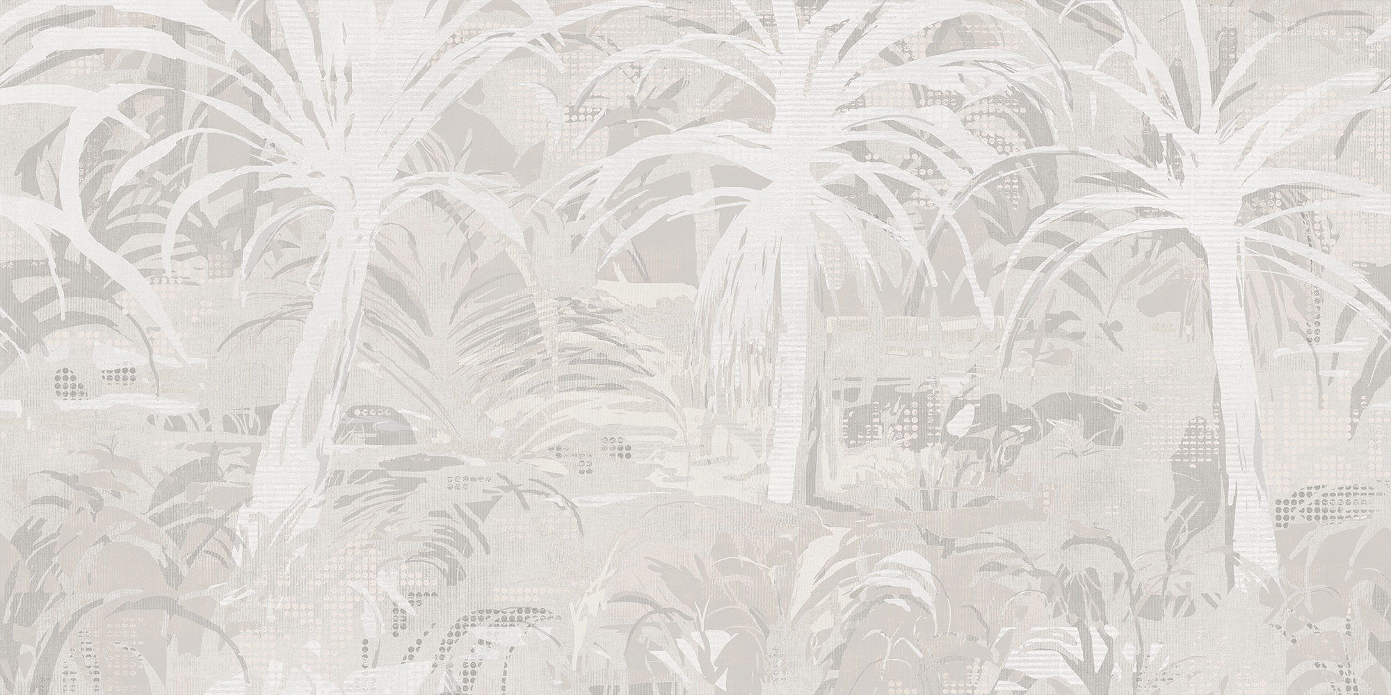 Chloris evoca una natura raffinata e silenziosa, con palme e vegetazione stilizzata in sovrapposizioni armoniche che creano profondità e ritmo. La palette calda e sofisticata trasforma le forme naturali in segni grafici, portando equilibrio, intimità ed eleganza contemporanea in residenze e spazi hospitality.