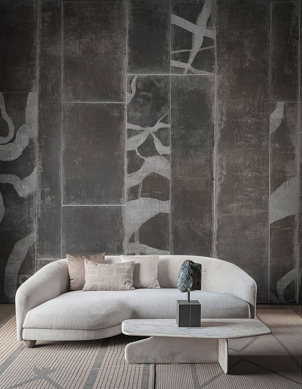 Equilibria è una carta da parati contemporanea che combina superfici luminose, segni fluidi e palette neutre per creare profondità ed eleganza. Integra ordine e spontaneità, definendo lo spazio con armonia senza dominarlo, ideale per residenze e ambienti hospitality di alto livello.