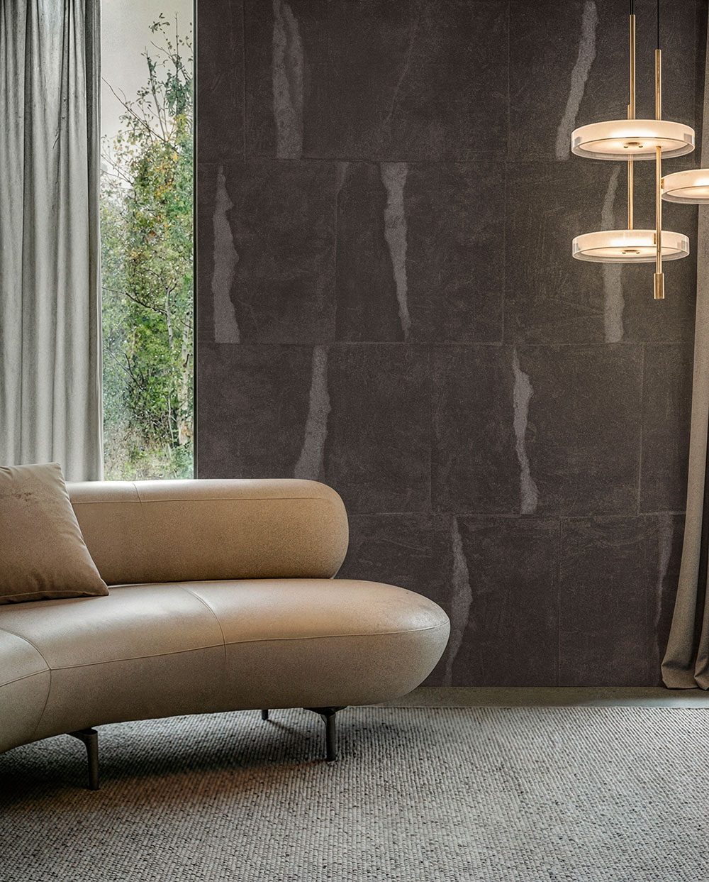 Hiatus è una superficie che evoca pausa e profondità, con linee verticali ritmate e variazioni cromatiche stratificate. Minerale e discreta, valorizza elegantemente lo spazio, ideale per architetture contemporanee, hospitality e progetti contract sensibili.