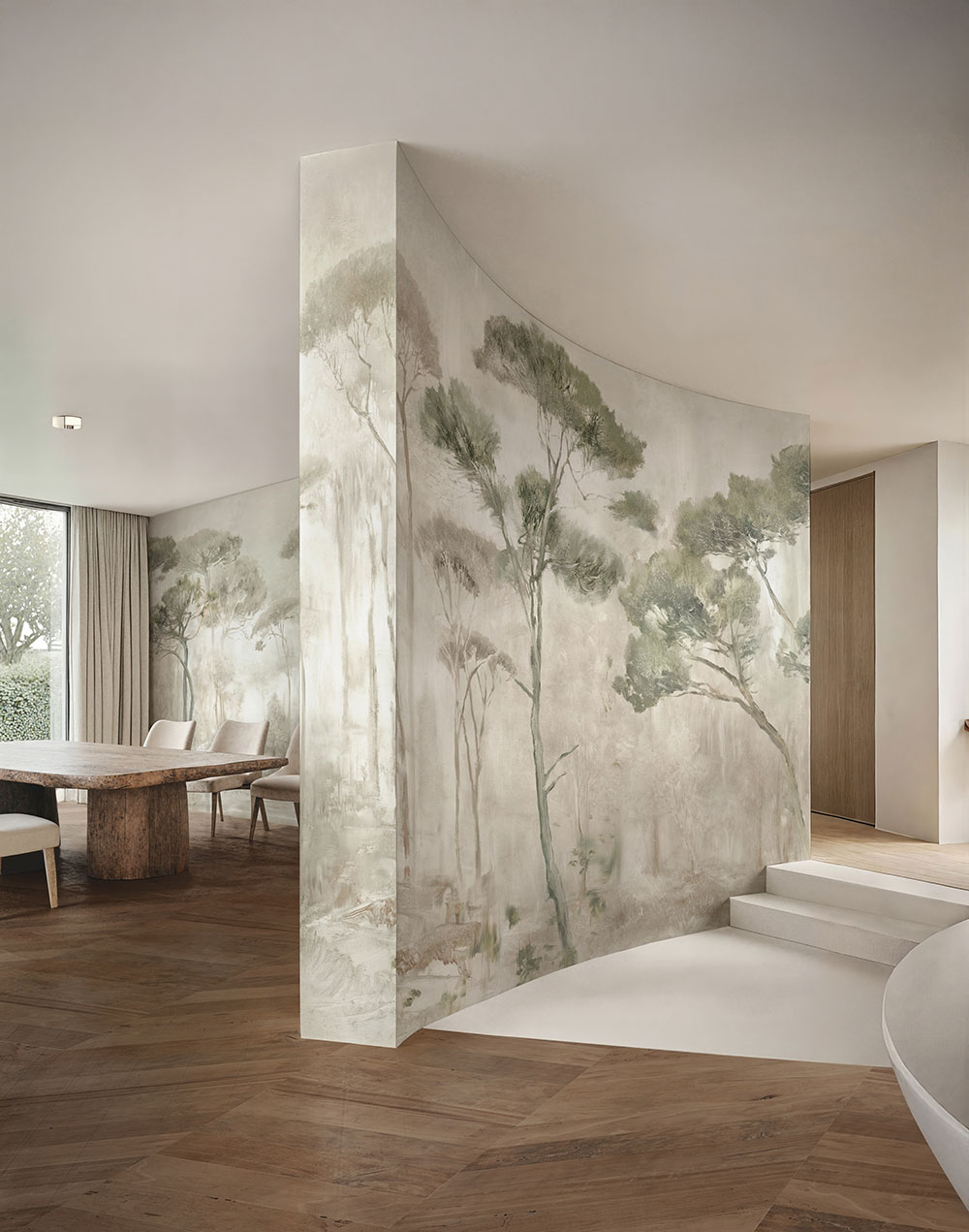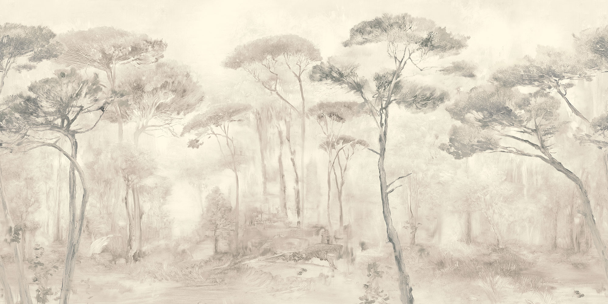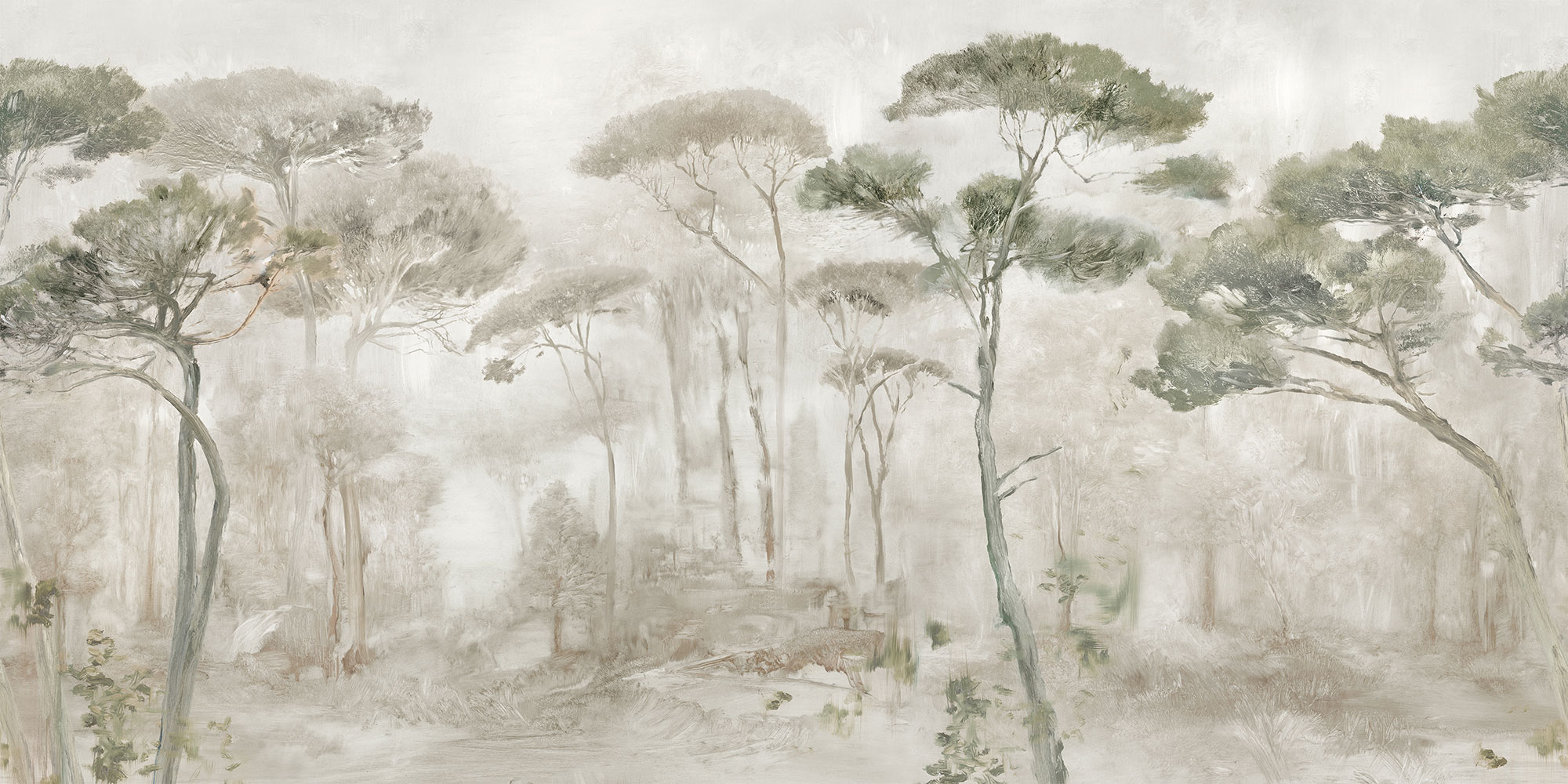 Pini mediterranei che emergono gradualmente in una superficie continua e silenziosa. Opacità, stratificazioni e variazioni tonali controllate creano un’atmosfera elegante che dialoga con architettura e materiali contemporanei. Ideale per hotel, spa, uffici e residenze evolute.