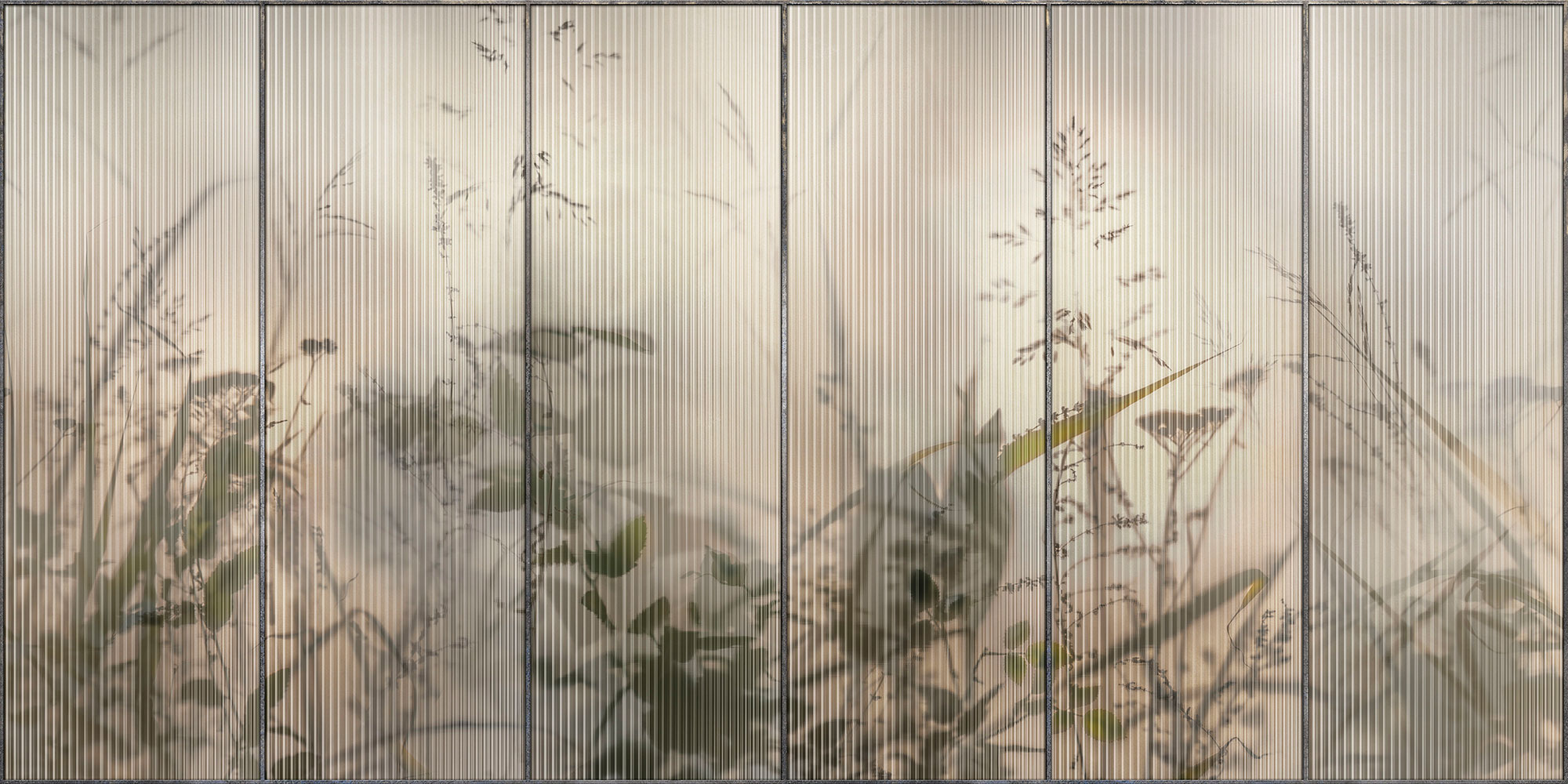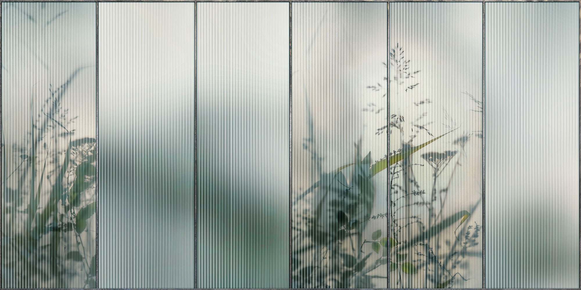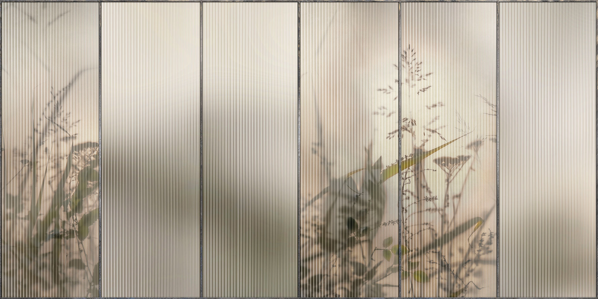 Le forme botaniche emergono in modo sfumato e delicato, quasi fossero ombre naturali proiettate dalla luce del mattino. La rigatura verticale del vetro cannetto, crea profondità e ritmo, trasformando la superficie in un elemento architettonico raffinato.