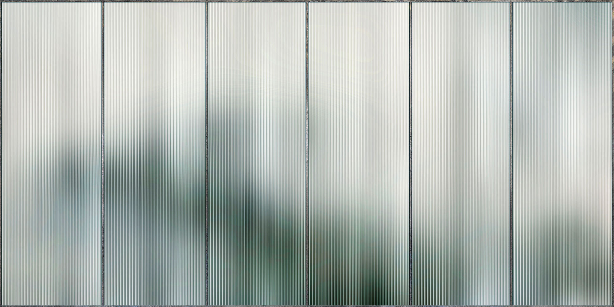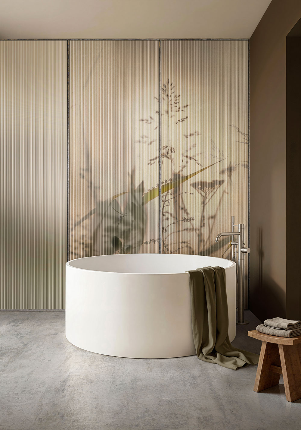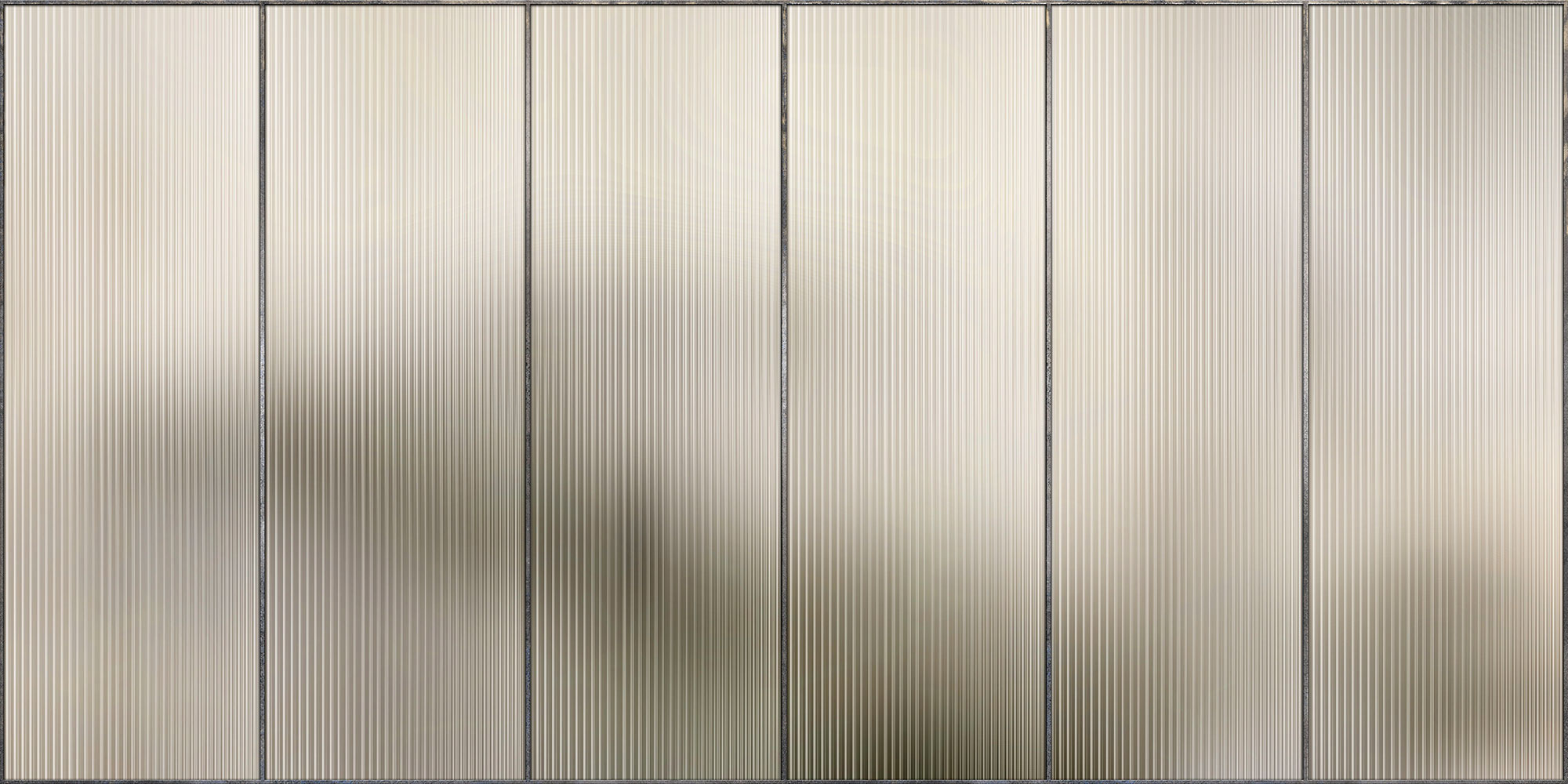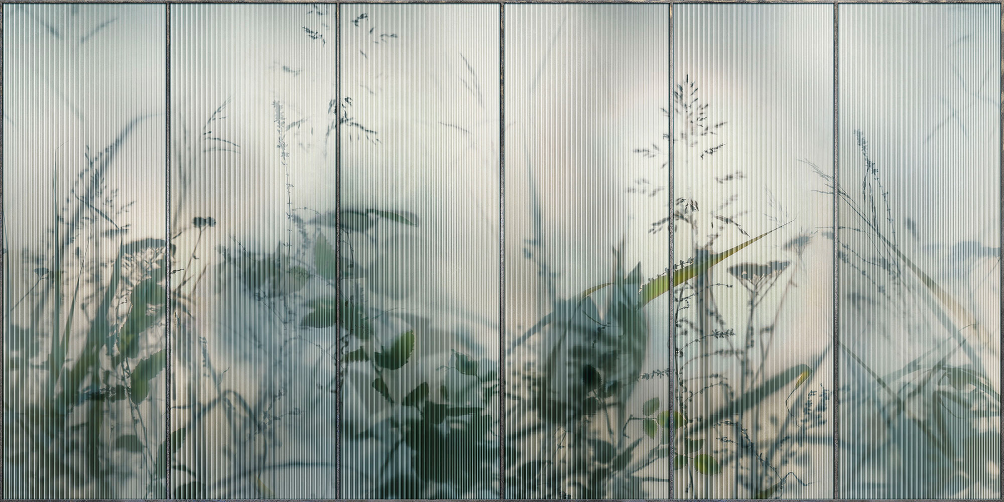 Le forme botaniche emergono in modo sfumato e delicato, quasi fossero ombre naturali proiettate dalla luce del mattino. La rigatura verticale del vetro cannetto, crea profondità e ritmo, trasformando la superficie in un elemento architettonico raffinato.